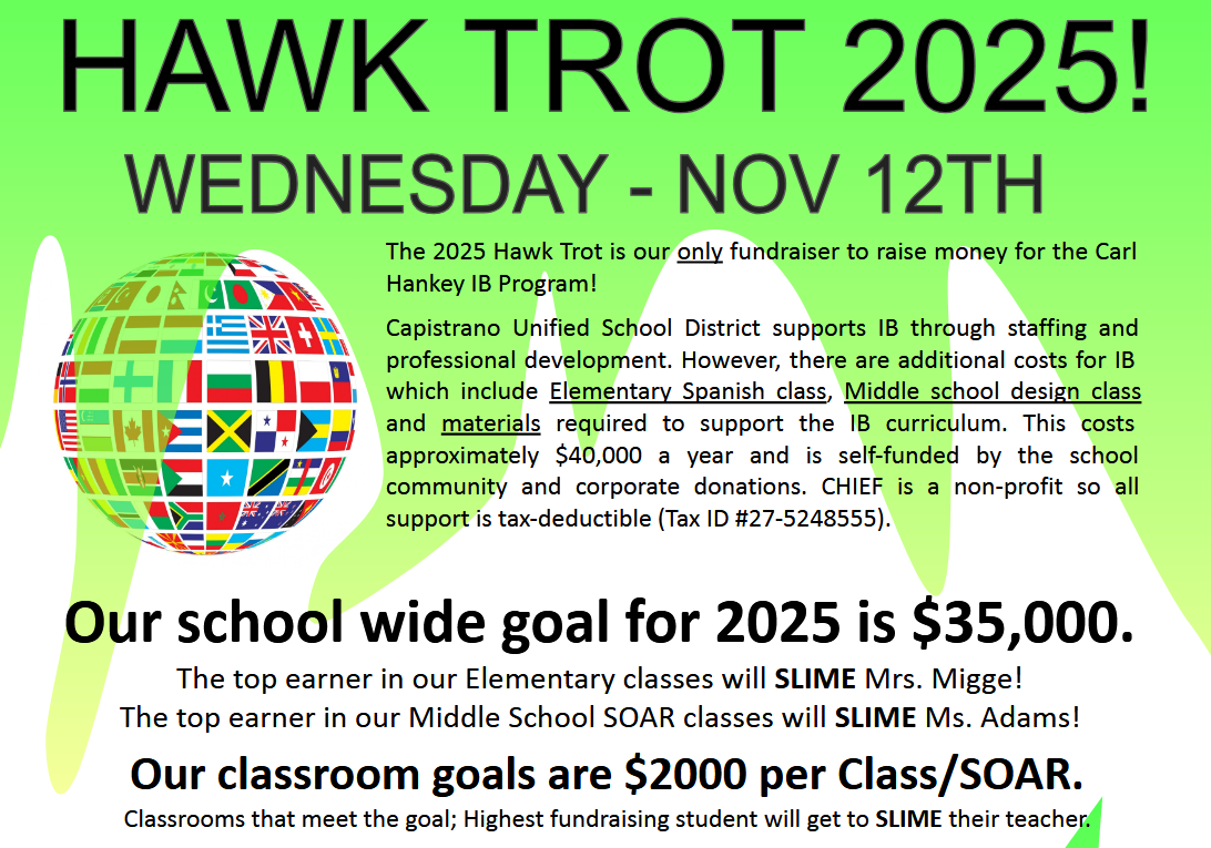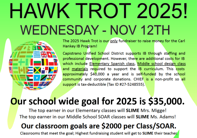 Today we wrapped up our Hawk Trot fundraiser with an unforgettable SLIME Day celebration. Thank you to Principal Migge, Vice Principal Adams, Ms. Cantacessi, Ms. Keehn, Ms. Peterson, Ms. Baldwin, and Ms. Lohmeier for getting slimed for IB. Students and parents filled the blacktop with cheers, laughter, and applause as our amazing staff bravely took their turn getting slimed.