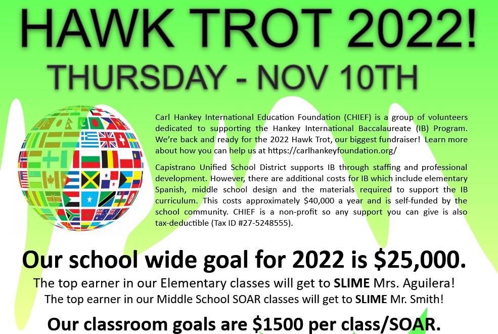 Flyers should have gone home with your students Friday 10/13/2023 to let you know about CHIEF’s biggest fundraiser of the year, our olympic themed fun run, the Hawk Trot.